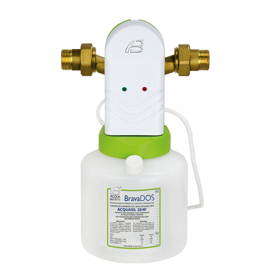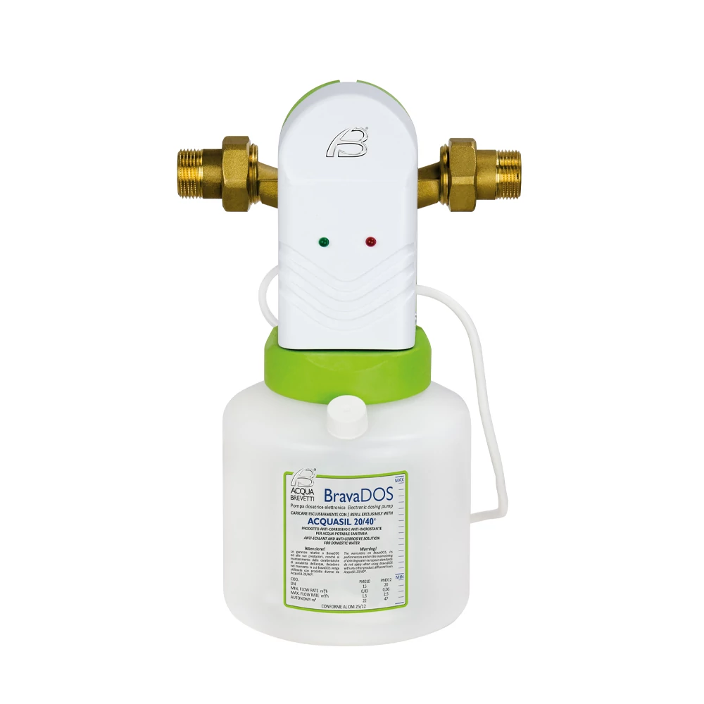 BravaDOS A BravaDOS egy elektronikus térfogatarányos adagolószivattyú az AcquaSIL 20/40 ® adagolásához , egy vízkőmentesítő korróziógátló termék. A BravaDOS sárgaréz csatlakozólappal, műanyag szivattyúházzal készül. Az 1" csatlakozású modelleknél a hidraulikus beépítéshez anyákat és csapokat szállítanak. A BravaDOS polifoszfát alapú termékek adagolására készült, még alacsony koncentrációban is, hogy megakadályozza a vízkő képződését és korrózió a szaniter vezetéken.