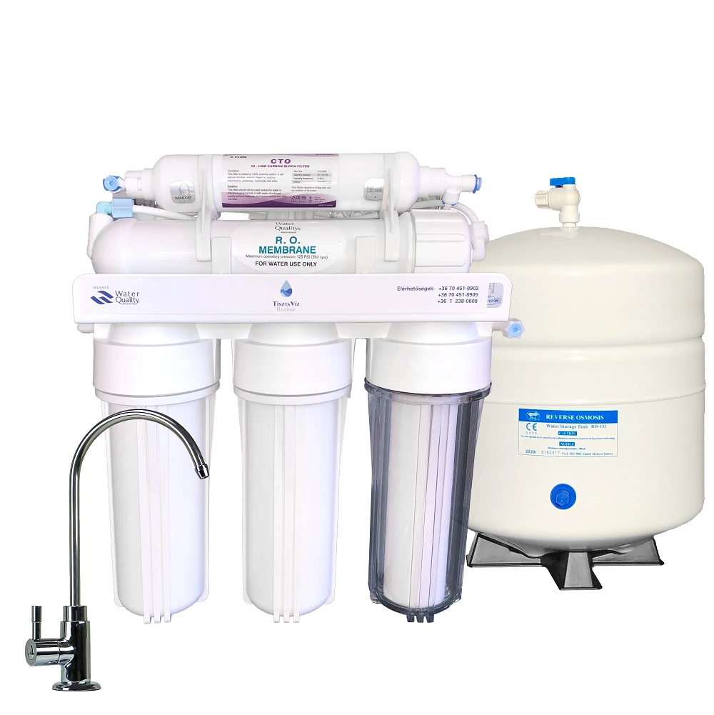 Felépítése: Három előszűrő (PP 5 μ + G.A.C. + PP 1 μ) + RO membrán + utószénszűrő + külső tartály + krómozott csaptelep + beszerelési tartozékok.